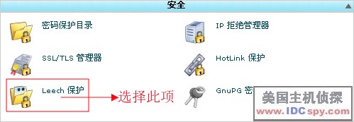 1、首先登陆到cPanel面板中(登陆方法),然后在安全菜单栏下选择“Leech保护”选项,具体设置如下图所示:
